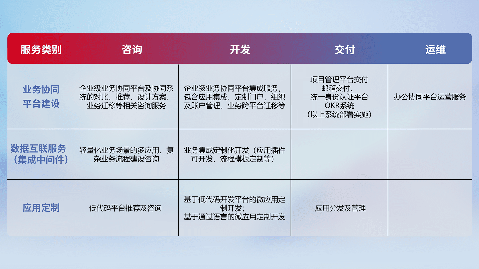 针对钉钉、、企微、、、IDaas等平台级产品提供产品的规划、、、、方案、、交付、、、定制化开发等服务,,实现如统一协同办公、、、、智能客户服务、、混合会议管理、、智能数据查询、、、、等业务场景,,实现数字化转型。。