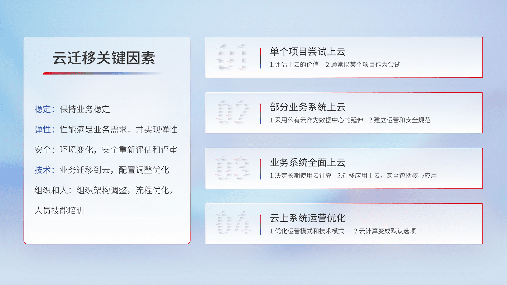 结合实际业务,,,从规划设计、、、云平台选型、、、、云原生改造、、、数据迁移、、、集成交付,,,迁移全过程为客户识别最佳上云路径,,做好风险识别管理,,,,设计网络架构、、身份权限、、、安全审计合规、、操作审计、、、日志审计、、监控告警策略、、多站点容灾设计等,,,,对云上基础设施进行整体规划,,提升IT治理水平,,以满足弹性、、、高可用、、、高性能的需求。。。