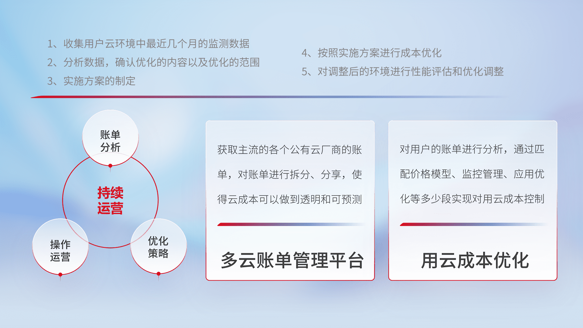 通过多云纳管,,,以统一的资源数据模型把客户的云资源进行抽象和封装,,,,进而实现对多云资源的统一操作,,,保障云资源管理的可靠性、、稳定性与可用性。。。。量身定制化运维内容,,,配置、、、开发运维、、补丁管理、、、备份、、监控、、、认证和访问管理、、、、审计和日常巡检等,,,保障在用云过程中的可靠度,,,稳定度以及高可用率。。。。